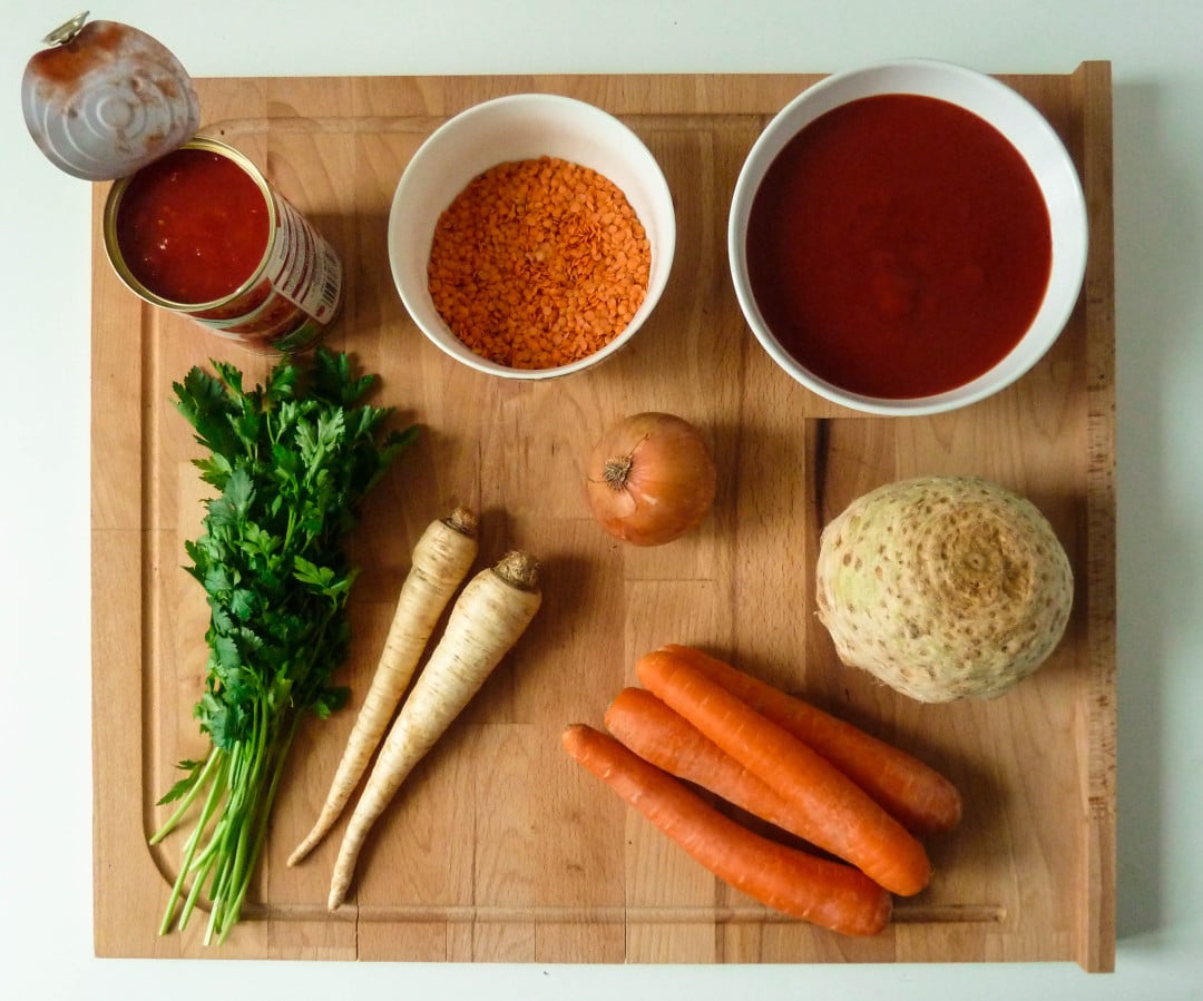 Na patelni rozgrzewamy dwie łyżki masła, dodajemy posiekaną w kostkę cebulę i suszone pomidory. Gdy cebula i pomidory się podsmażą, dodajemy marchewkę, selera i pietruszkę pokrojone w kostkę. W międzyczasie podgrzewamy na małym ogniu bulion warzywny. Po ok. 7 minutach dosypujemy na patelnię przyprawy i smażymy ok. 2 minut. Całość dodajemy do bulionu i gotujemy ok. 10-15 minut. Po tym czasie dodajemy: soczewicę, pomidory z puszki, przecier, cukier, ocet balsamiczny i sos sojowy. Gotujemy na wolnym ogniu aż warzywa zmiękną. Na koniec doprawiamy solą i pieprzem wedle uznania. Zupę podajemy z kleksem śmietany i natką pietruszki. Pycha 🙂